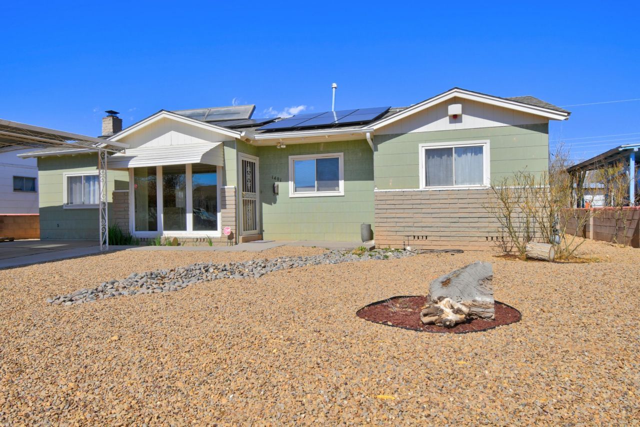 Be prepare to be surprised as you step inside this beautifully updated home! Located in the desirable North Valley, the home features a flexible layout perfect for many living arrangements including multi-generational. Nearly every aspect has been remodeled and re-designed, including the primary bedroom, primary bath and the kitchen. Owned solar, refrigerated air, furnace, and mini split systems, all installed in 2024. Other improvements include a newer roof, stucco, and windows. Located near the acequia and walking paths, this home combines modern updates with the charm of the North Valley. A wonderful opportunity to own a move-in-ready property in a highly sought after area!