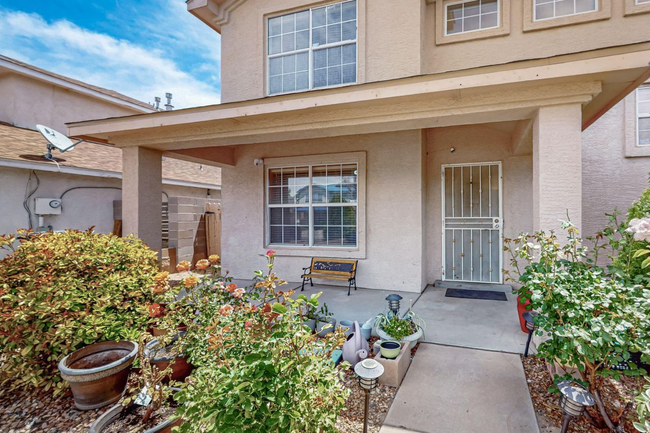 Welcome Home! This spacious 4-bedroom, 2.5-bath gem offers comfort, functionality, and style in a prime location. Enjoy elegant tile flooring in the kitchen, all bathrooms, and foyer. The upgraded kitchen features modern appliances and a bar area, flowing seamlessly into a formal dining room with breathtaking views of the Sandia Mountains. A beautifully crafted oak staircase includes an installed stair lift for added accessibility and convenience. The front yard is beautifully landscaped with mature trees and vibrant rose bushes, creating stunning curb appeal. Step outside to a large, private backyard with a covered patio, ideal for relaxing or entertaining. An additional flex space provides the potential for a fifth bedroom, home office, or hobby room to suit your needs.