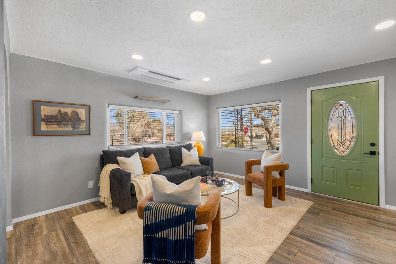 Come see this beautiful custom Ridgecrest home on a quiet & scenic raised corner lot. Full floor-to-ceiling remodel completed in 2022 by licensed contractors. Huge kitchen with large center island, high-end appliances and granite counters. 3 remodeled baths with custom tile. Recent refrig A/C, recent paint, texture, trim and lighting throughout. Includes two family rooms and a formal dining area. Large primary suite with three large closets. Don't miss the 400 sq ft rooftop deck with gorgeous mountain views, plus rear patio is set up for outdoor kitchen with frost-free plumbing and a gas connection. Recent TPO roof & stucco. 1 br and full bath on first floor. Private backyard plus alley with back yard access and detached garage. Xeriscaped front & rear!