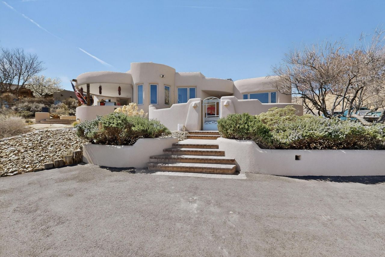 Panoramic views, this 3600sf 4/3/3 custom home on a cul-de-sac in the iconic village with stellar views of the Rio Grande Valley, city lights, and 50 miles of mountain ranges. Stunning sunrises/sunsets, city events from the perfect vantage point. Modernized in 2025 with a mountain chic design. The home features open concept with Oklahoma flagstone, Saltillo tile, and hand-painted Talavera tile floors. The kitchen was redesigned for an entertainer/chef with Bluestar Range/Hood, Thermador 65b wine fridge, 72'' fridge/freeze, ice maker, custom cabinets, RO system, quartz counters, farm sink & more. Features a wine/bar room, solar, gas, water purification, irrigation/landscaping, radiant heat, central vac, outdoor kitchen and patios, paved drive, RV parking, laundry/dog wash, and 3-car garage