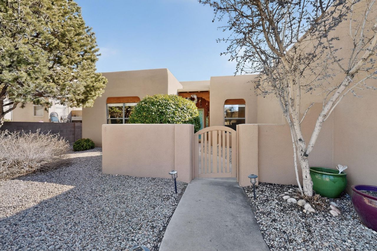 Step into this charming one-level Southwest home with 4 bedrooms, 2 baths, and two living spaces with one open to the kitchen for cooking and entertaining. Features high wood-beam ceilings, recessed lighting, and gas fireplace in the main living area. Spacious kitchen with tile backsplash, butcher block countertops, and stainless steel appliances. Family dining room and sliding doors to a low-maintenance, south-facing backyard with Manzano Mountain views - perfect winter sun. Primary suite with his-and-hers sinks, tub, shower, and walk-in closet. Recent newer HVAC refrigerated air system upgrade.