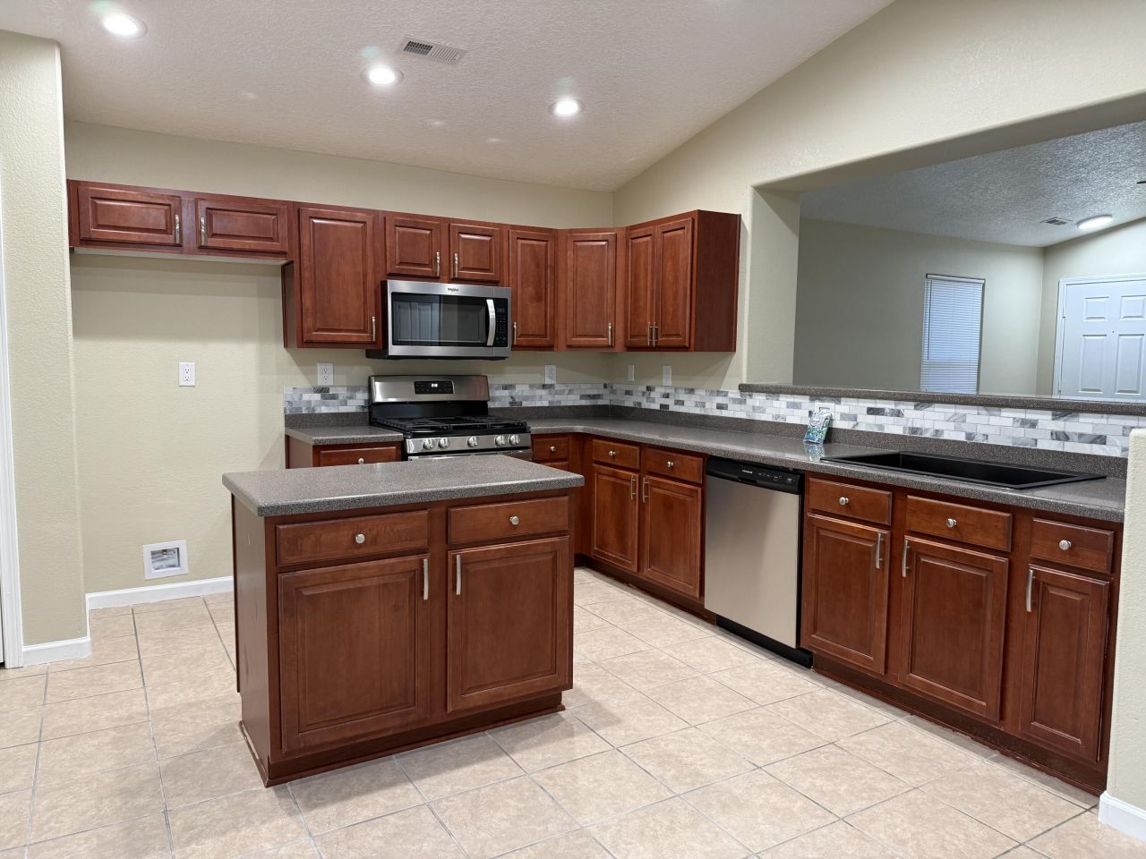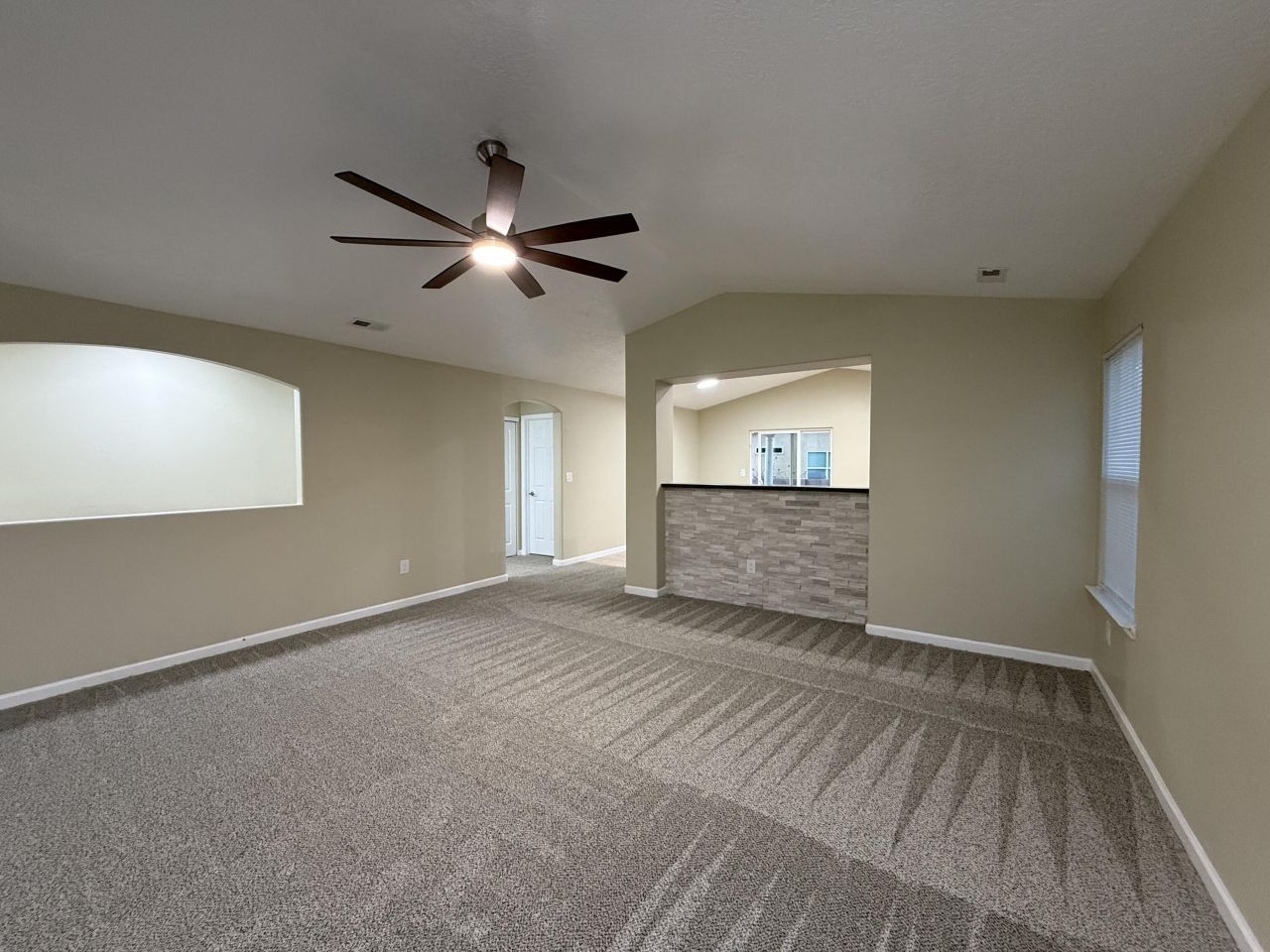 Single-story home featuring 3 bedrooms and 2 full bathrooms. and a 2-car garage. Recent updates include new two-tone paint, new carpet, new stainless steel appliances, and new fixtures throughout. The living room offers a stacked-stone accent feature and a large ceiling fan.